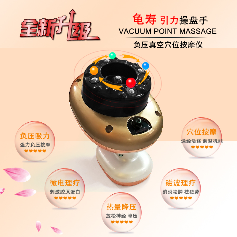 龟寿操盘手-是具有刮痧排毒功能,养生。而且升级了无线使用功能,充电2小时可以使用2小时。另外还具有拔罐功能。是当今比较流行的美容仪器,适合家用和美容院仪器中使用。详情介绍可以参考下面图片介绍:
